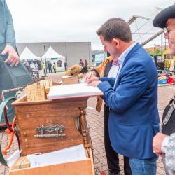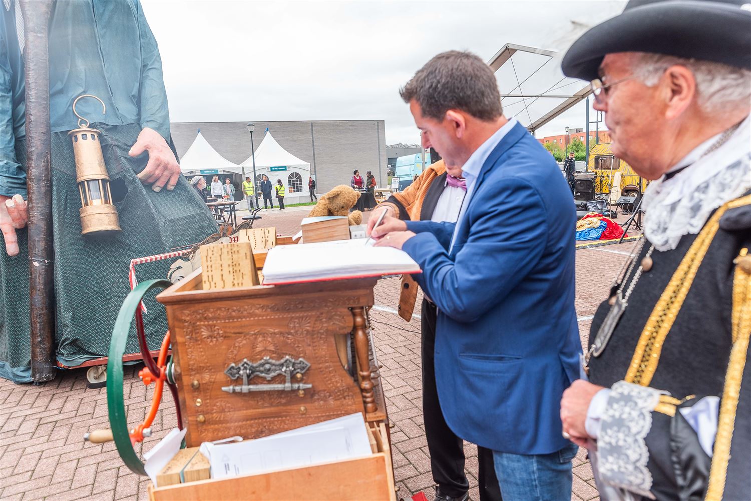 Er waren toespraken vanuit de gildes en door burgemeester Mario Borremans die zijn nieuwste inwoner welkom heette. Alleen … het waren stomme speeches … zoals in een stomme film waren de echte toespraken niet te horen en werden gebracht door een verteller. Waarmee ook naar een oud gebruik werd verwezen.